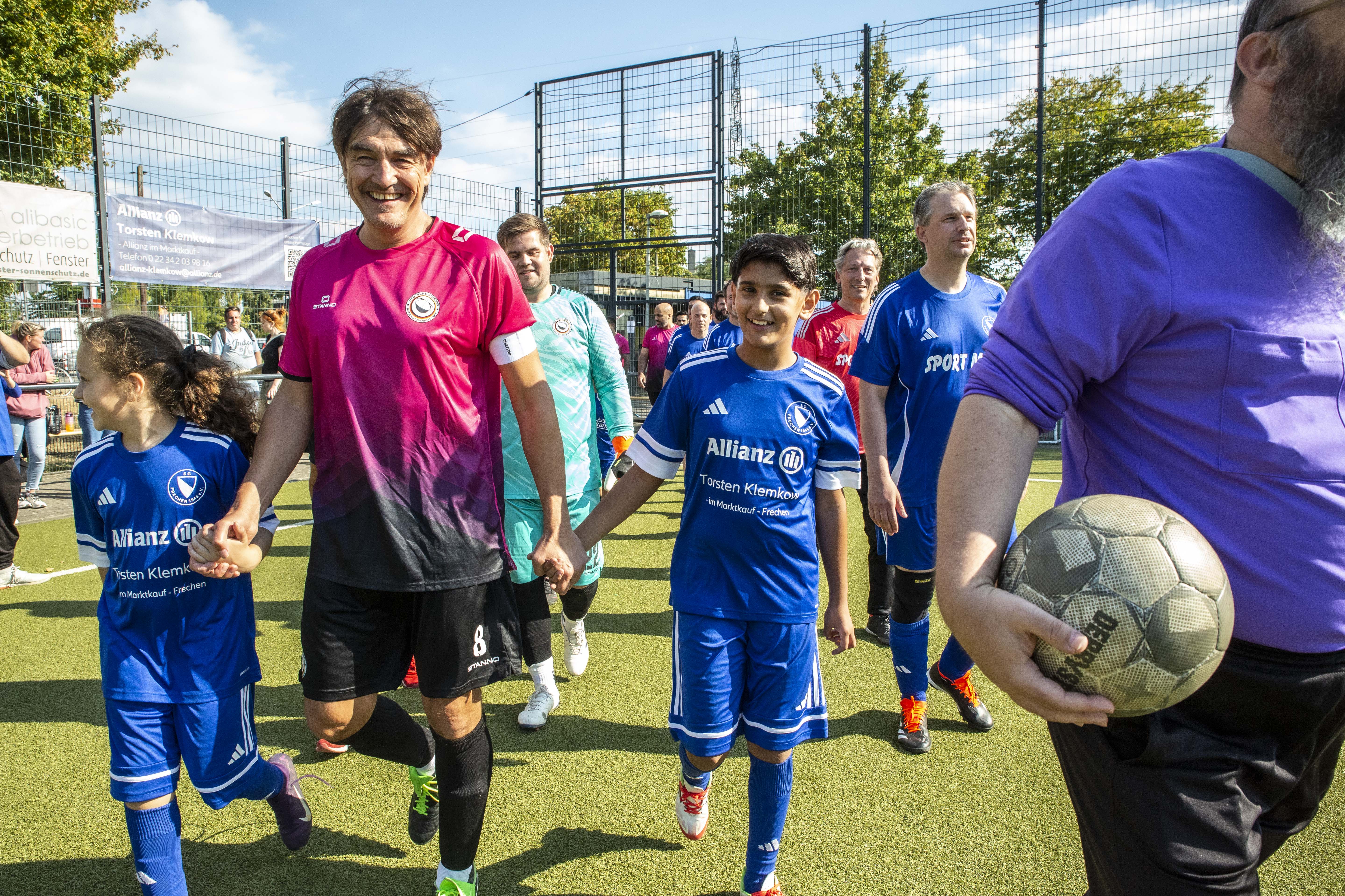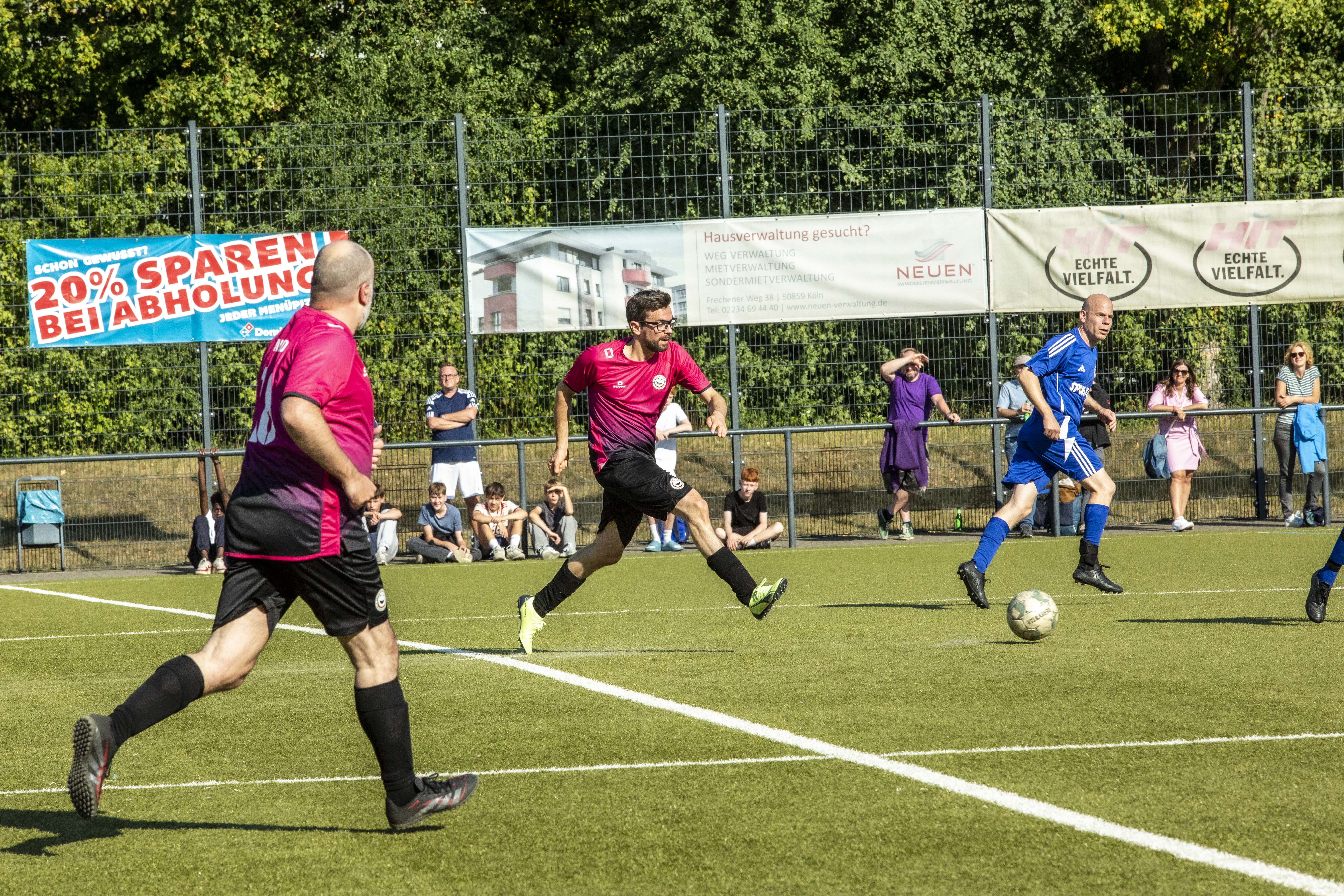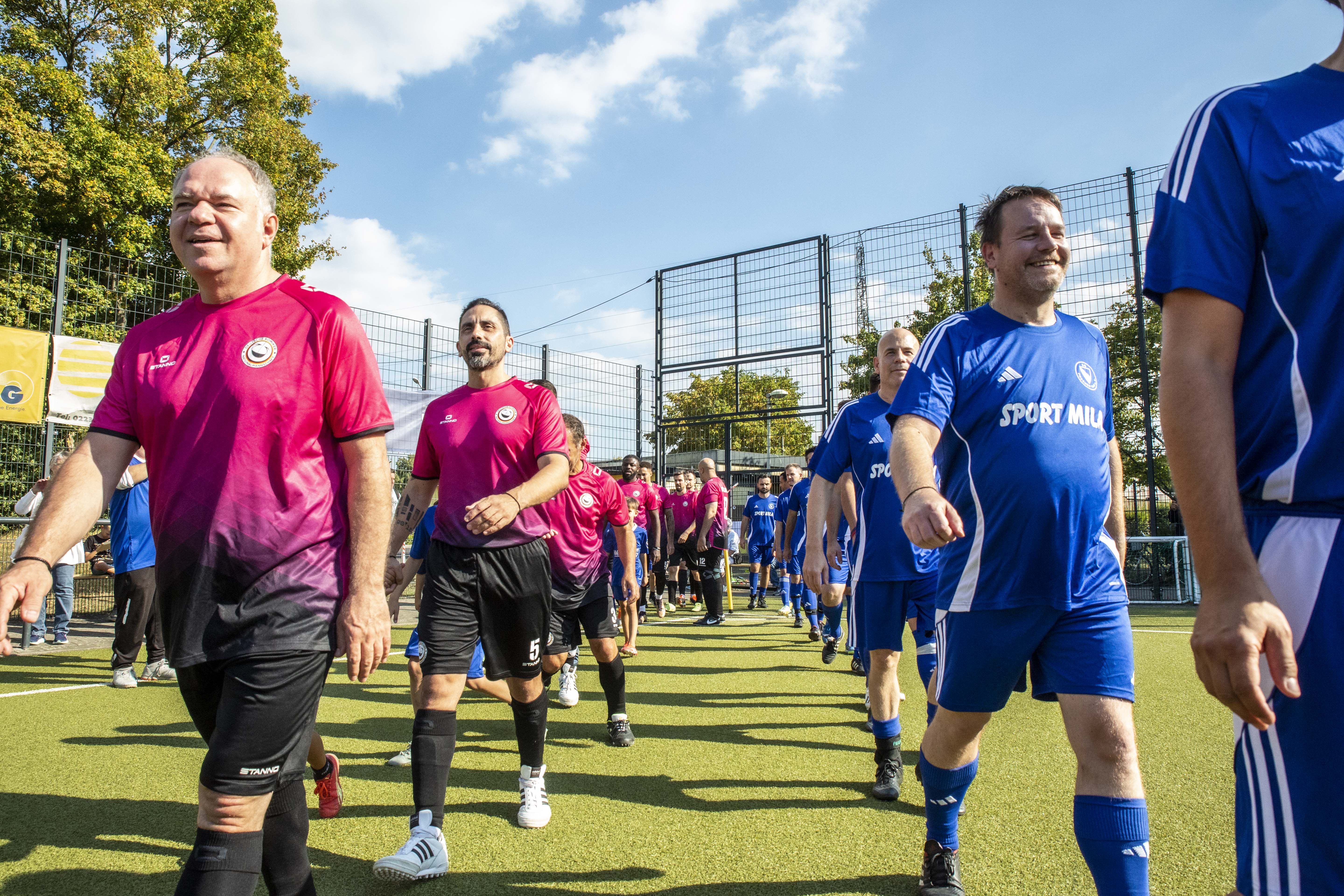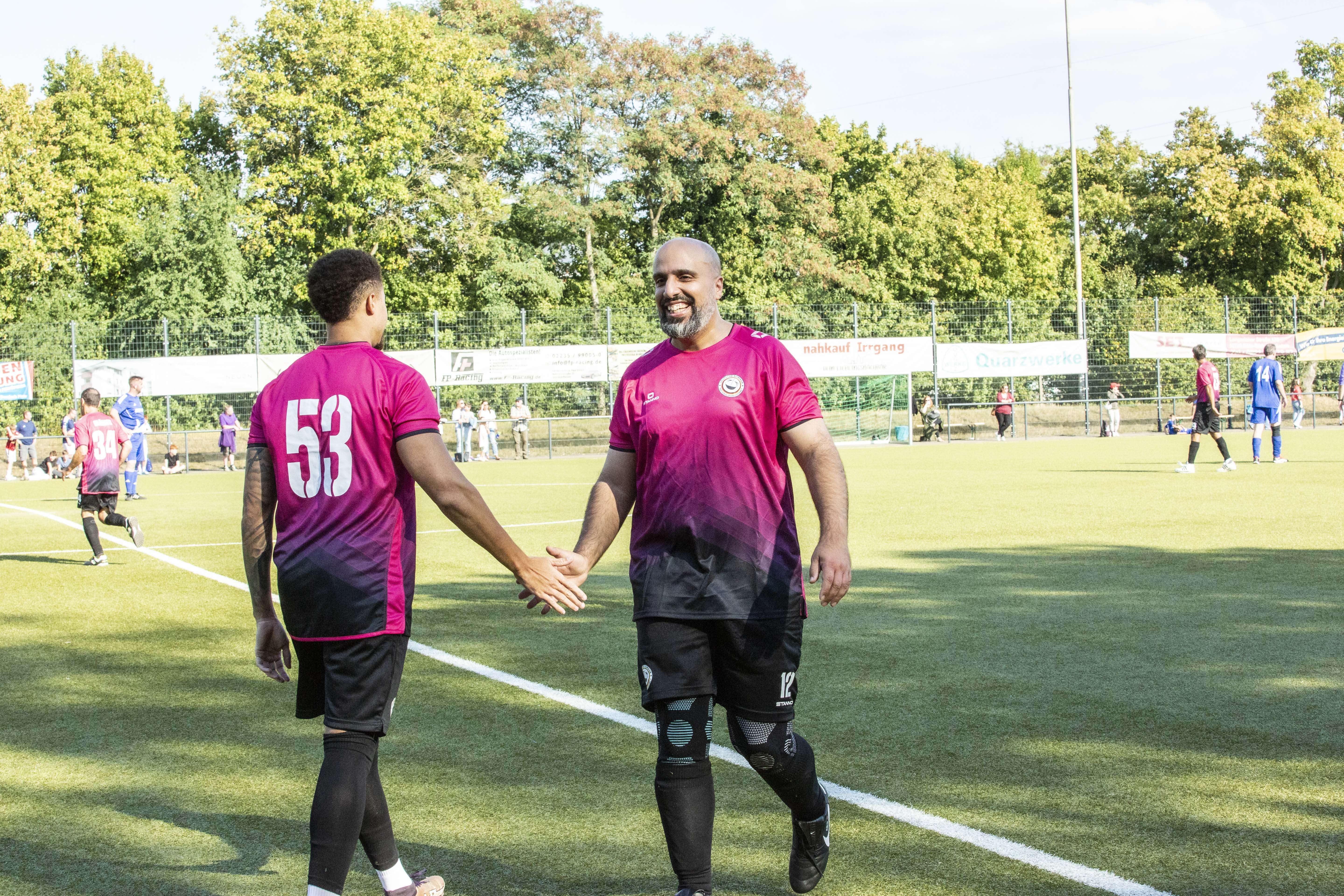 Im Rahmen der Saisoneröffnung der SG Frechen 46 am 24. August hatte die Deutsche Komikernationalmannschaft die Ehre gegen eine Allstar-Elf des Gastgebers antreten zu dürfen. Vorab möchten wir unbedingt festhalten, das sich unsere Mannschaft herzlich willkommen und bestens versorgt fühlen durfte! Ganz herzlichen Dank dafür! Aber rein in die Partie. Nach einer kurzen Abtastphase, ergriff die von Chefcoach Joti Stamatopoulos bestens eingestellte Elf um Capitano Matze Knop die Initiative und erspielte sich ab Spielminute 10 erste gute Einschussmöglichkeiten. In der 13. Minute war es dann soweit. Lokalmatador und Frechens Top-Comedian Mohamed El Boujaddaini nertzte nach feinem Zuspiel über den Mittelfeldchef Matin zum 1:0 ein. Das 2:0 folgte in Folge eines schnellen Konters vier Minuten später. Der Anschlusstreffer gelang dem Gastgeber dann prompt. Dieser wurde jedoch rasch erwidert und so ging es mit einem 3:1 für die Deutsche Komikernationalmannschaft in die Pause. In der zweiten Halbzeit war der Gastgeber bemüht, schnellstmöglich den Anschlusstreffer zu erzielen. Doch bevor es dazu kam, erhöhte die bestens aufgelegte Mannschaft von Joti Stamatopoulos, der u. a. mit Ewald Lienen, Nuri Sahin und Oliver Reck gearbeitet hat, auf vier und fünf zu eins. In die Torschützenliste trugen sich mit seinem zweite Treffer Mohamed El Boujaddaini und Spielmacher Matin ein. Dem 5:2 ließen die kickenden Komiker den sechsten und siebten Treffer folgen. Mit 7:2 ging eine stets fair geführte und durchaus unterhaltsame Partie schließlich zu Ende. Erwähnt sei an dieser Stelle aber noch der Prämiernauftritt von Abdelkarim, der in seinem ersten Spiel der deutschen Komikernationalmannschaft absolut zu gefallen wusste.